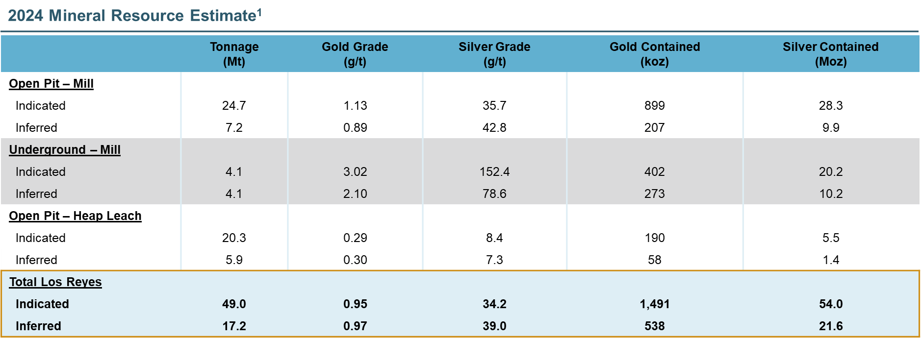 Los Reyes is a low-sulphidation, epithermal gold-silver deposit that could be mineable from a combination of open pit and underground and currently hosts an Indicated Resources of 1.5 million ounces of gold and 54.0 million ounces of silver, as well as an Inferred Resources of 538 thousand ounces of gold and 21.6 million ounces of silver. Excluding low grade heap leach material, Los Reyes contains an Indicated Resource of 1.3 million ounces of gold and 48.5 million ounces of silver, as well as an Inferred Resource of 480 thousand ounces of gold and 20.2 million ounces of silver.